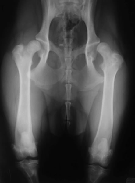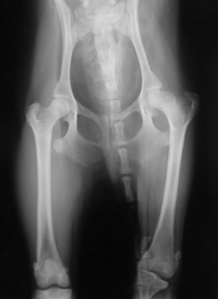 症状:散歩や運動を嫌う、段差を嫌がる、立ち上がるのに時間がかかる、腰を左右に大きく振りながら歩く(モンローウォーク)、横座りをする、ウサギのように両後肢を一緒に動かして走るなどの症状が4ヶ月~1歳齢頃にでます