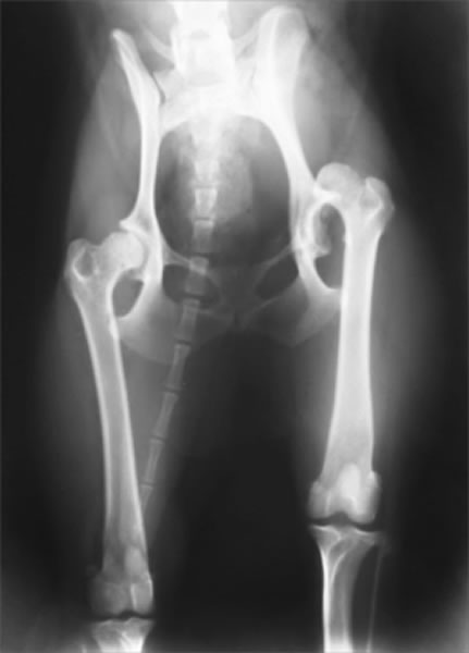 成長過程で股関節(寛骨と大腿骨)の発育異常が生じ、股関節に緩みが引き起こされる疾患です。緩みのある不安定な股関節を動かすことで、関節の軟骨部分が損傷を受け関節炎がはじまります。関節炎による痛みから跛行を呈します。