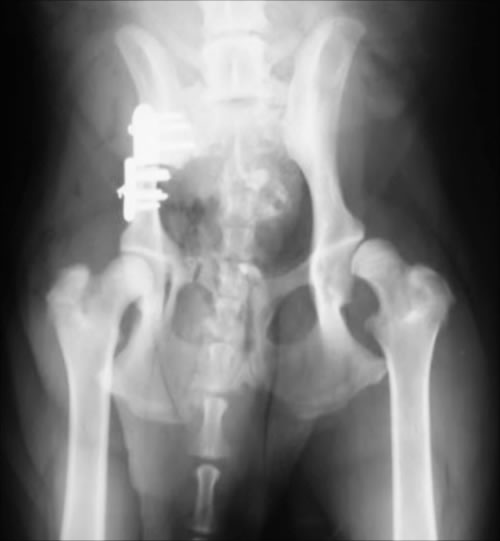 12~18週齢で可能な手術。恥骨結合を電気的に焼灼することで骨の成長を停止させます。これにより、寛骨臼による大腿骨頭のカバーがよくなるよう骨盤の形状を変化することを期待して行う手術です。