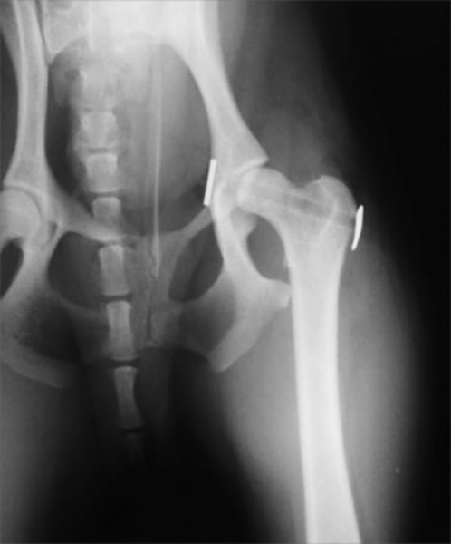 大腿骨頭を切除することで、寛骨臼と軟骨が損傷した大腿骨頭の直接的な接触をなくし痛みを取り除く方法です。何らかの原因でその他THR・DPO・TPOの手術ができない場合、保存的療法に反応しない場合、救済的な手術としておこないます。骨頭を切除した関節周囲に線維性偽関節が形成されるまで、不安定になるため、患肢を着地し負重するようになるまである程度の期間を要します。歩様が改善されるまで、リハビリテーションを行いながらサポートをいたします。