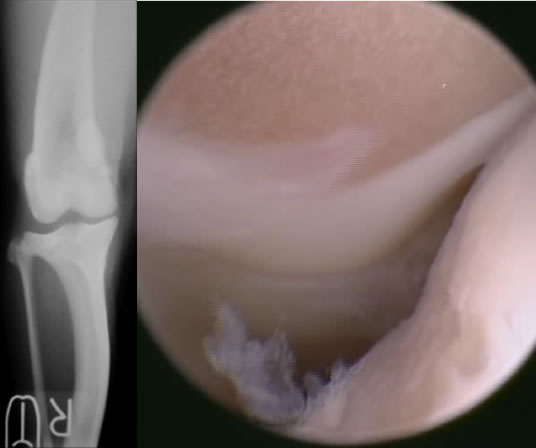 大腿骨骨頭の関節軟骨が成長障害により厚みを増し、損傷を受けやすくなり、軟骨が浮きあがりはがれることで痛みを生じます。