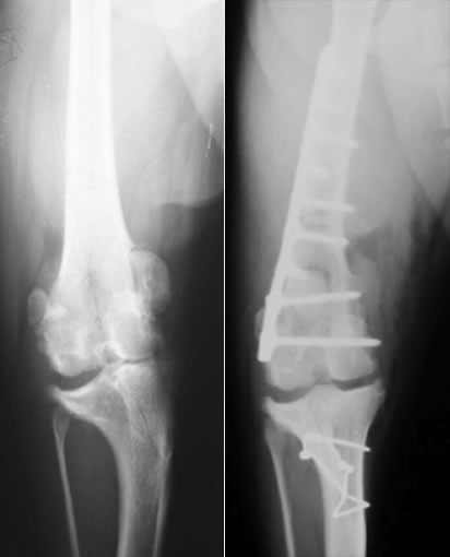 外科手術が適応であれば、Block Resectionによる造溝術と脛骨粗面転移術に加え、必要に応じて変形した大腿骨を矯正する骨切り術を同時におこない、膝蓋骨が正しい位置におさまるようアライメントをただします。