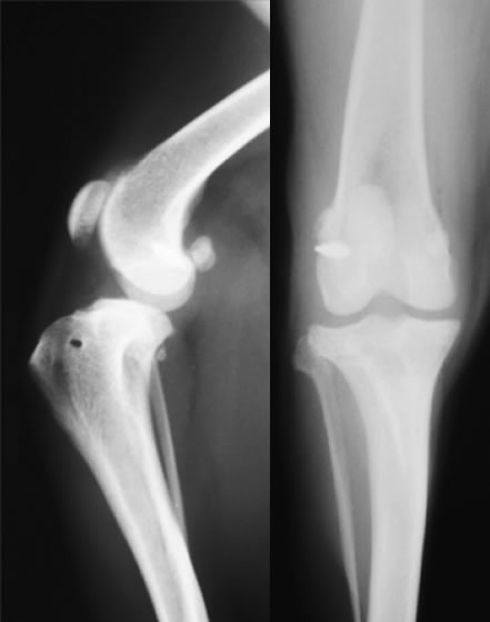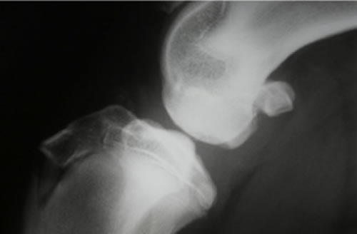 膝蓋骨が大腿骨遠位にある滑車溝から内方もしくは外方に脱臼する疾患です。膝蓋骨外方脱臼の症例では、内方脱臼よりも強い症状を呈することが多いです。